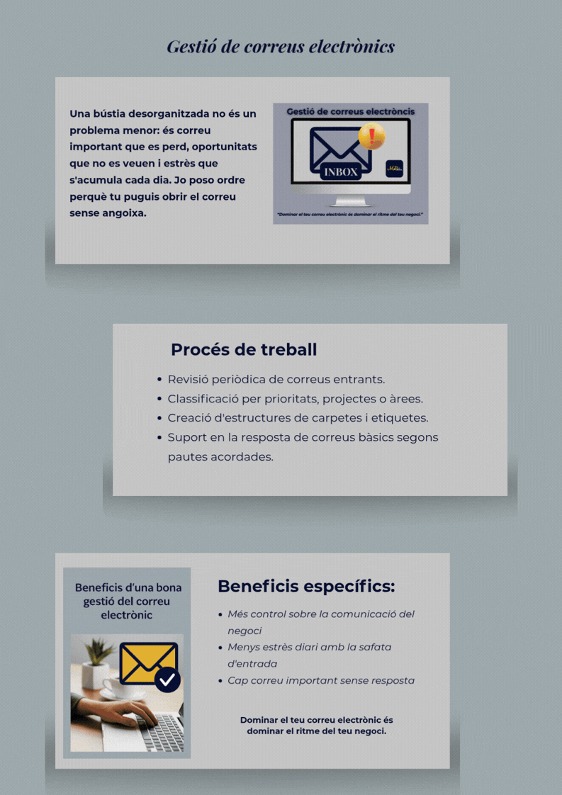 Vaig netejar i estructurar la bústia amb criteris clars. Vaig crear una agenda real, amb tots els compromisos registrats i un sistema d’avisos per als canvis d’última hora. I vaig configurar WhatsApp Business amb respostes automàtiques perquè cap client tornés a quedar-se sense resposta.